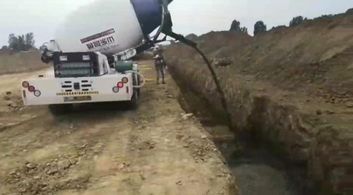 攪制完成后,270度旋轉(zhuǎn)的卸料口來(lái)回澆灌施工處