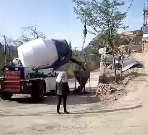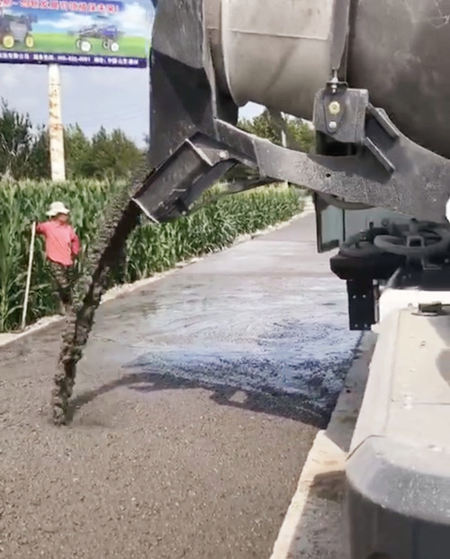 魯樽2.0方自動(dòng)上料攪拌車(chē)在路面僅僅3.5米寬的狹窄山村路上施工